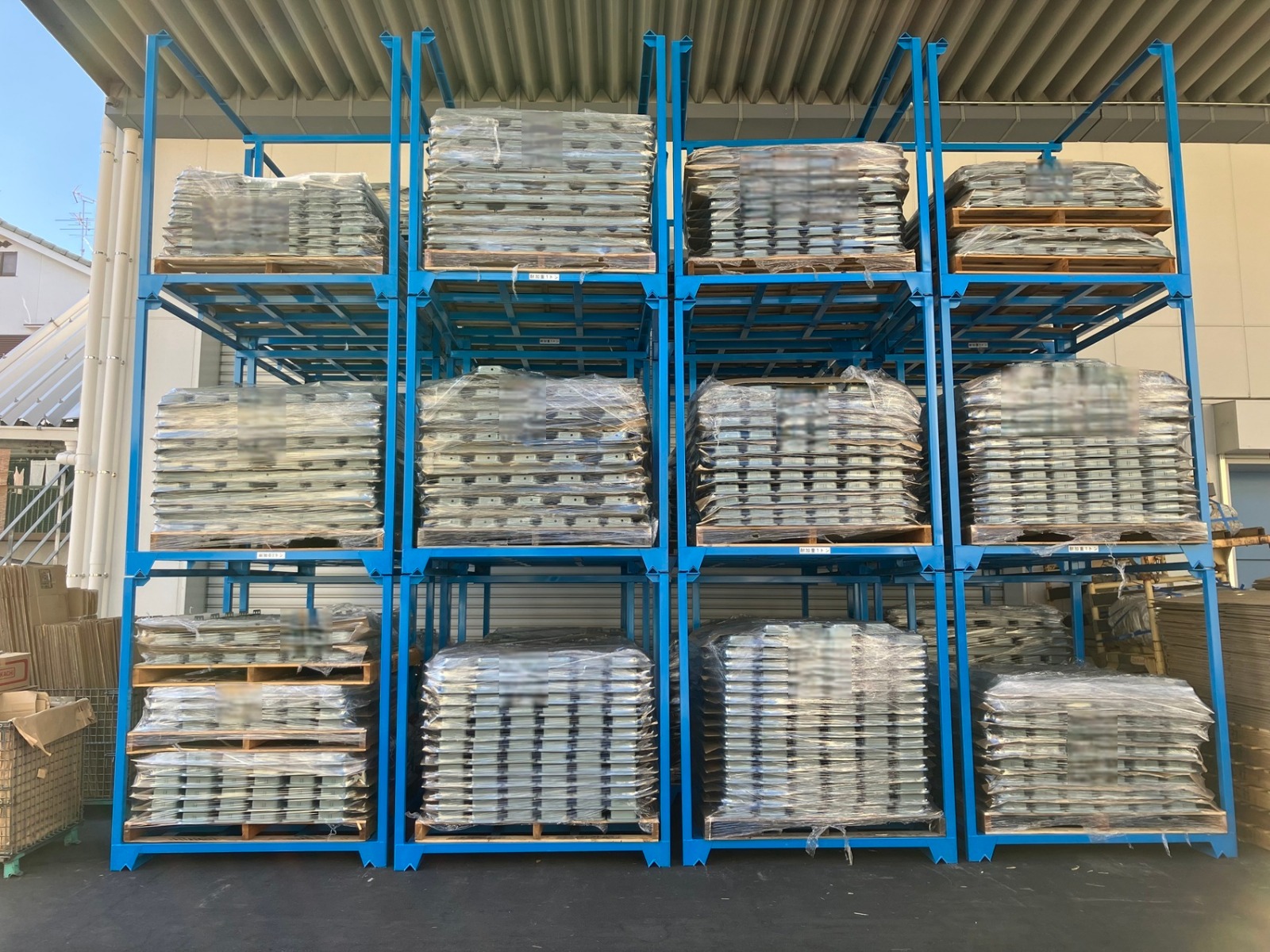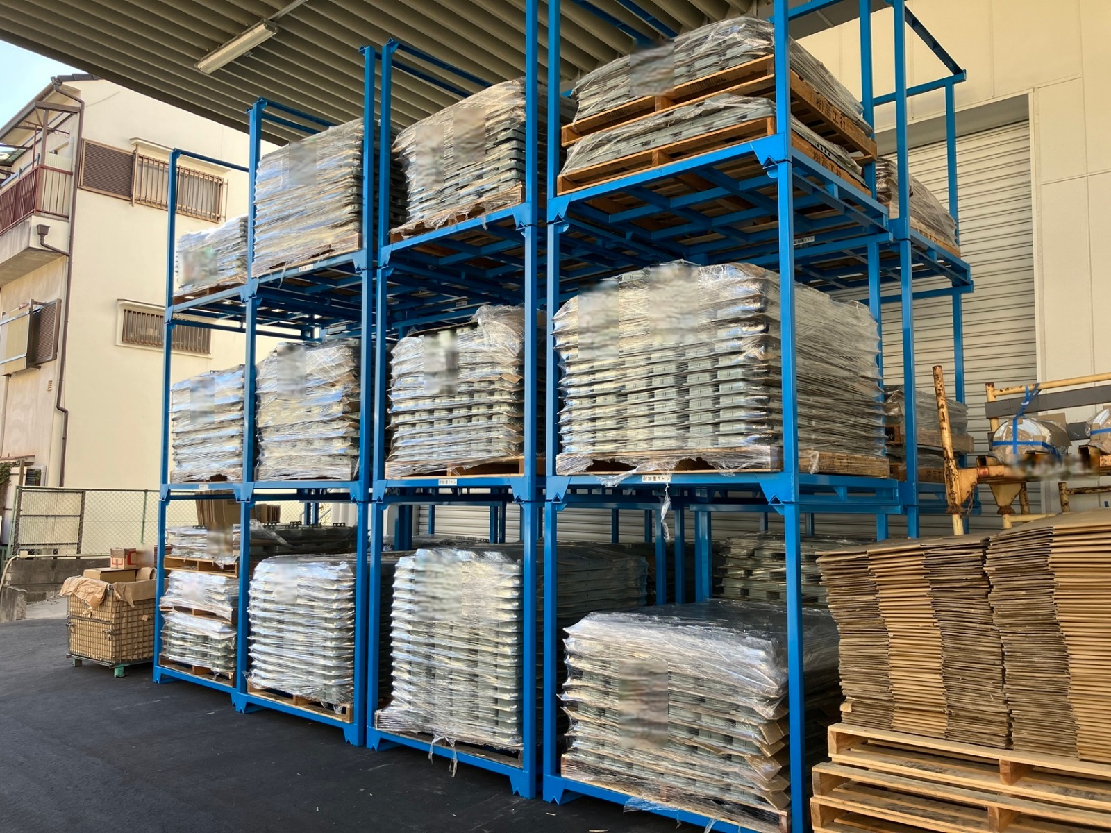 これまで倉庫内ラックに収まらないパレット積みのものは、段積み出来ない為、平面スペース分しか保管出来なかったが、ネスティングラック導入により、2段、3段積みが可能になり、保管量が大幅に増えました。