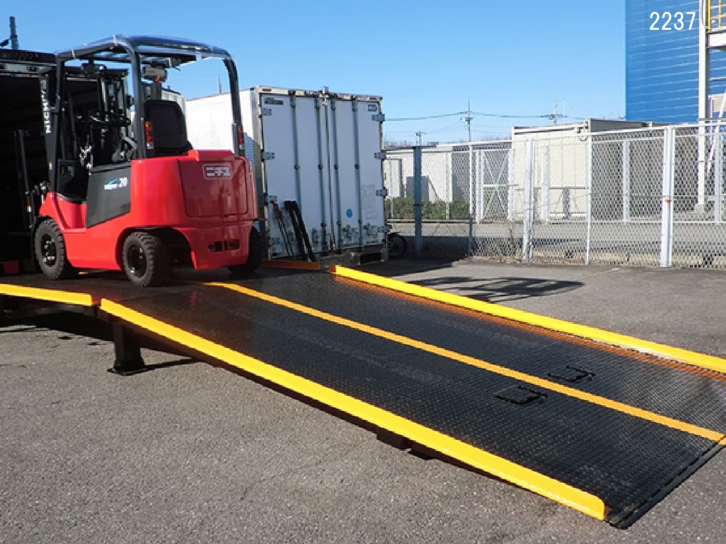 海上コンテナ内の荷物の出し入れを容易に行う為、直接フォークリフトを乗入れ・作業する為のスロープ