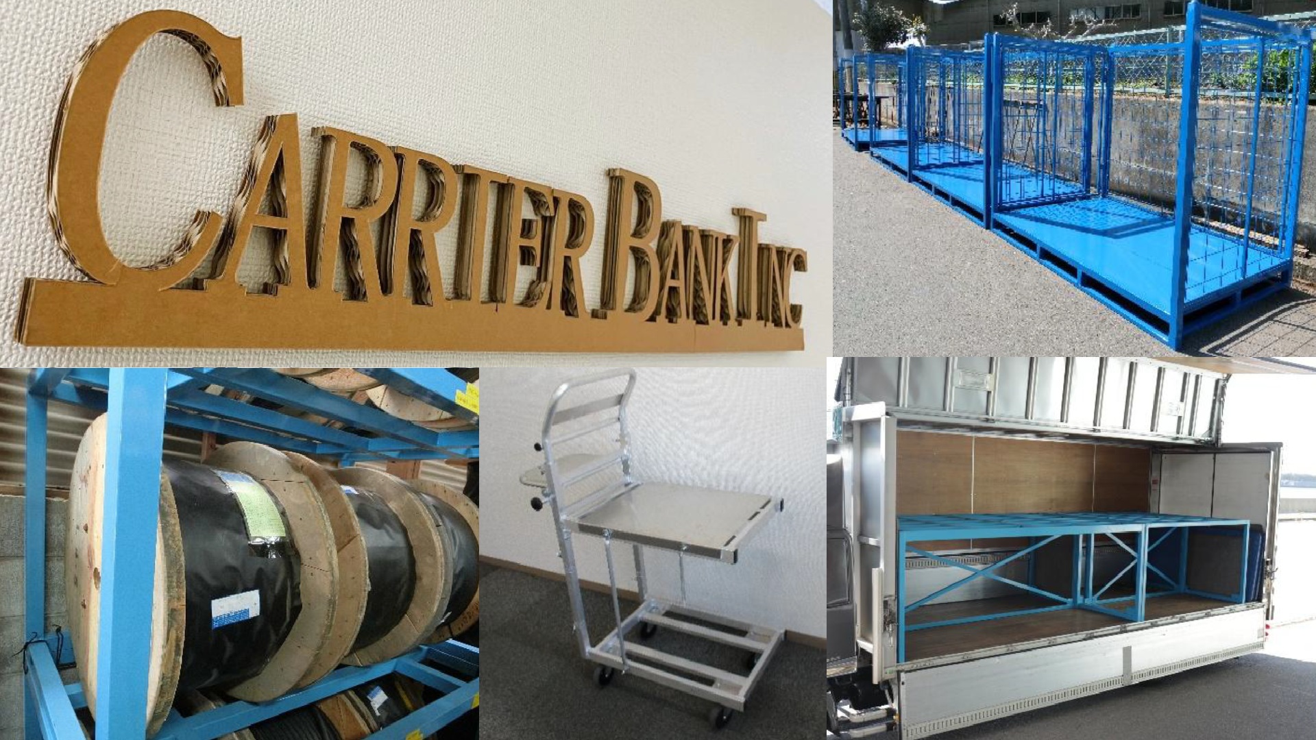 特寸ネスティングラック(大型・幅広・ガード付き等)、タイヤ保管ラック、ドラム保管ラック、長尺用ラック、トラック積載ラック、キャスター付き大型台車,鉄製台車、作業台、アルミ製台車、木製パレット各種、ダンボール製品各種