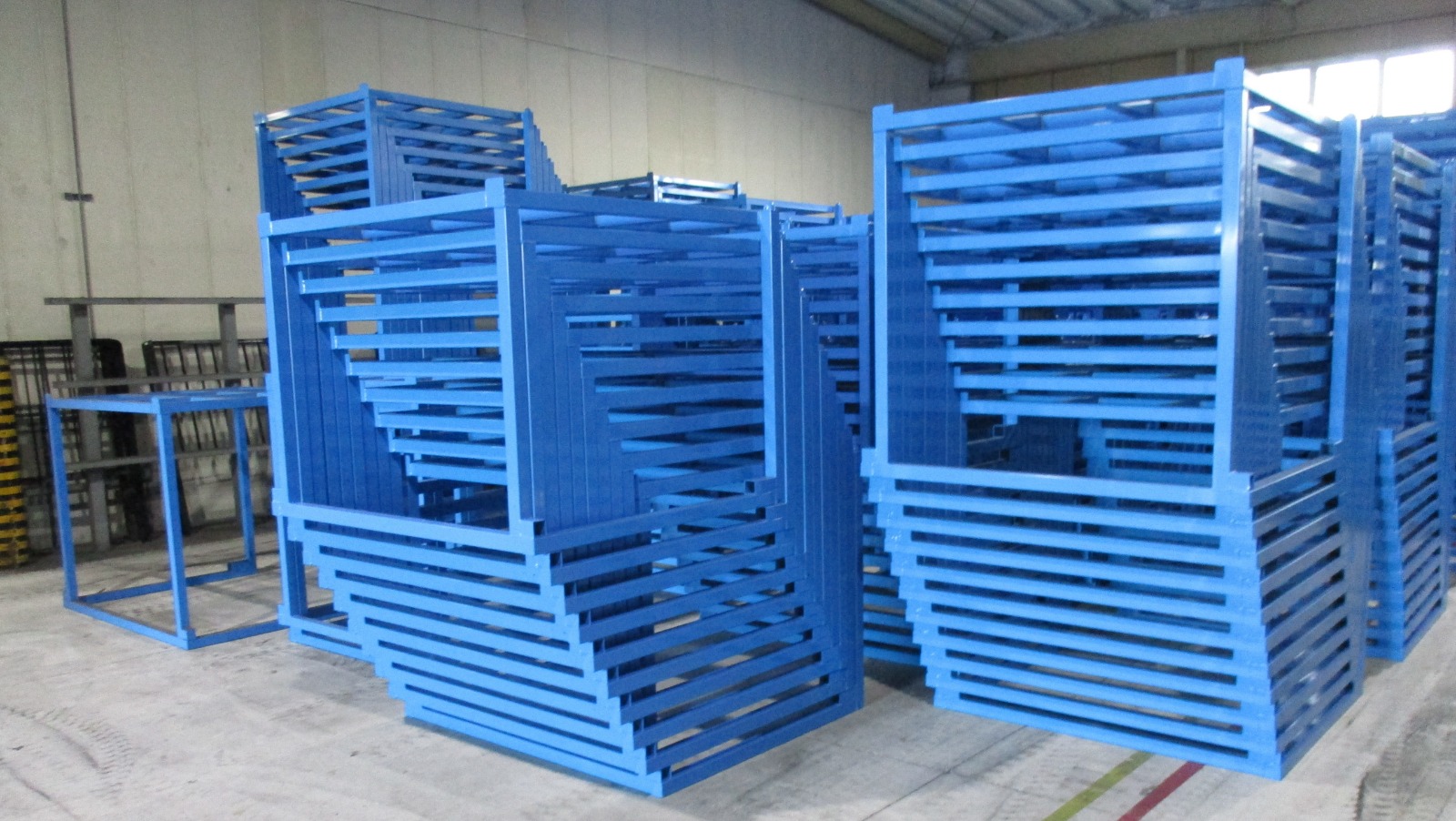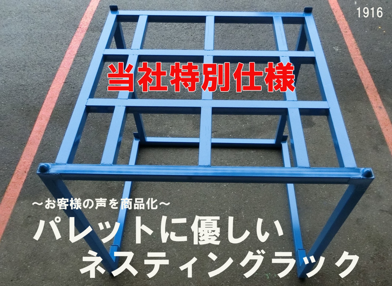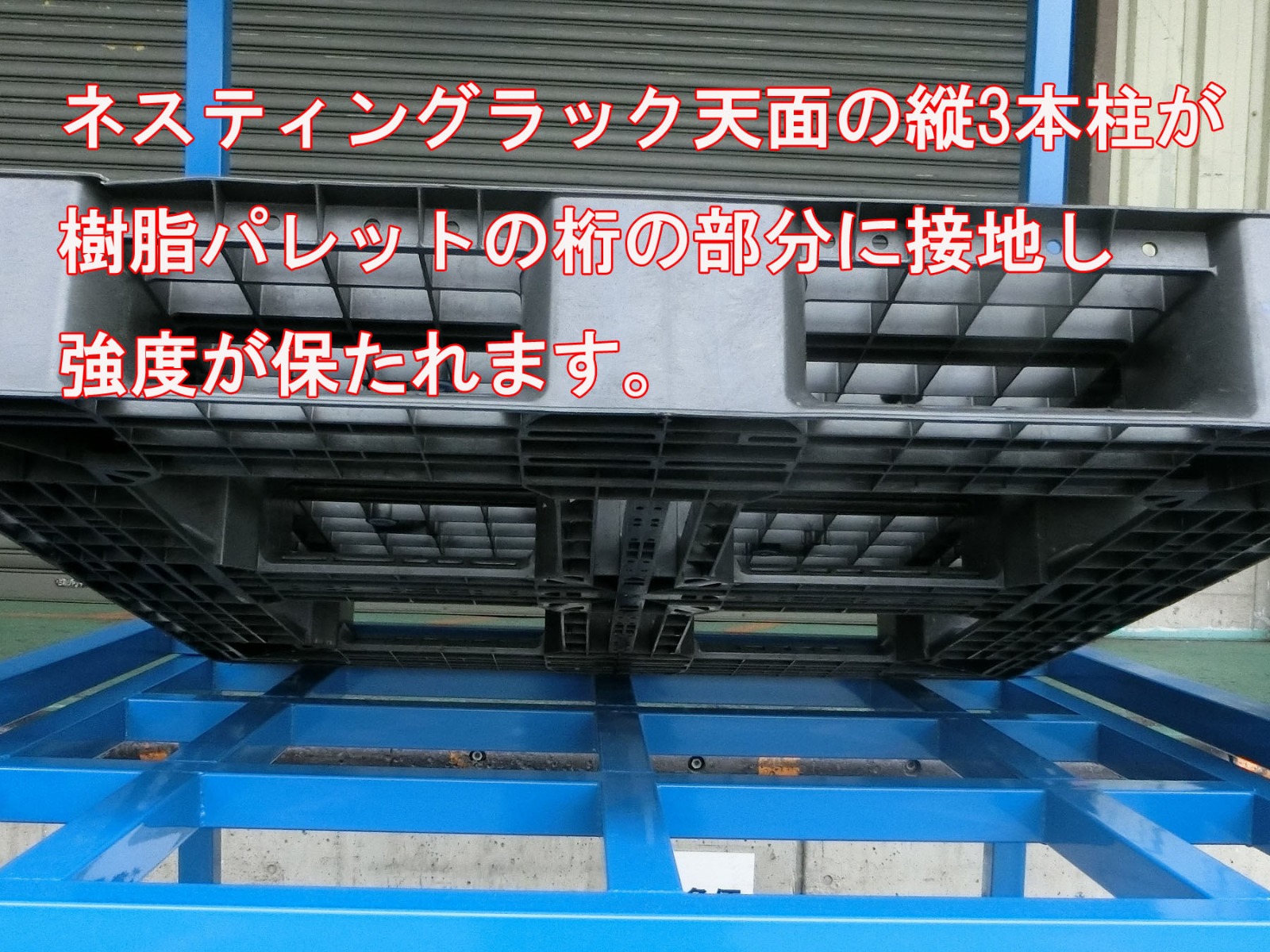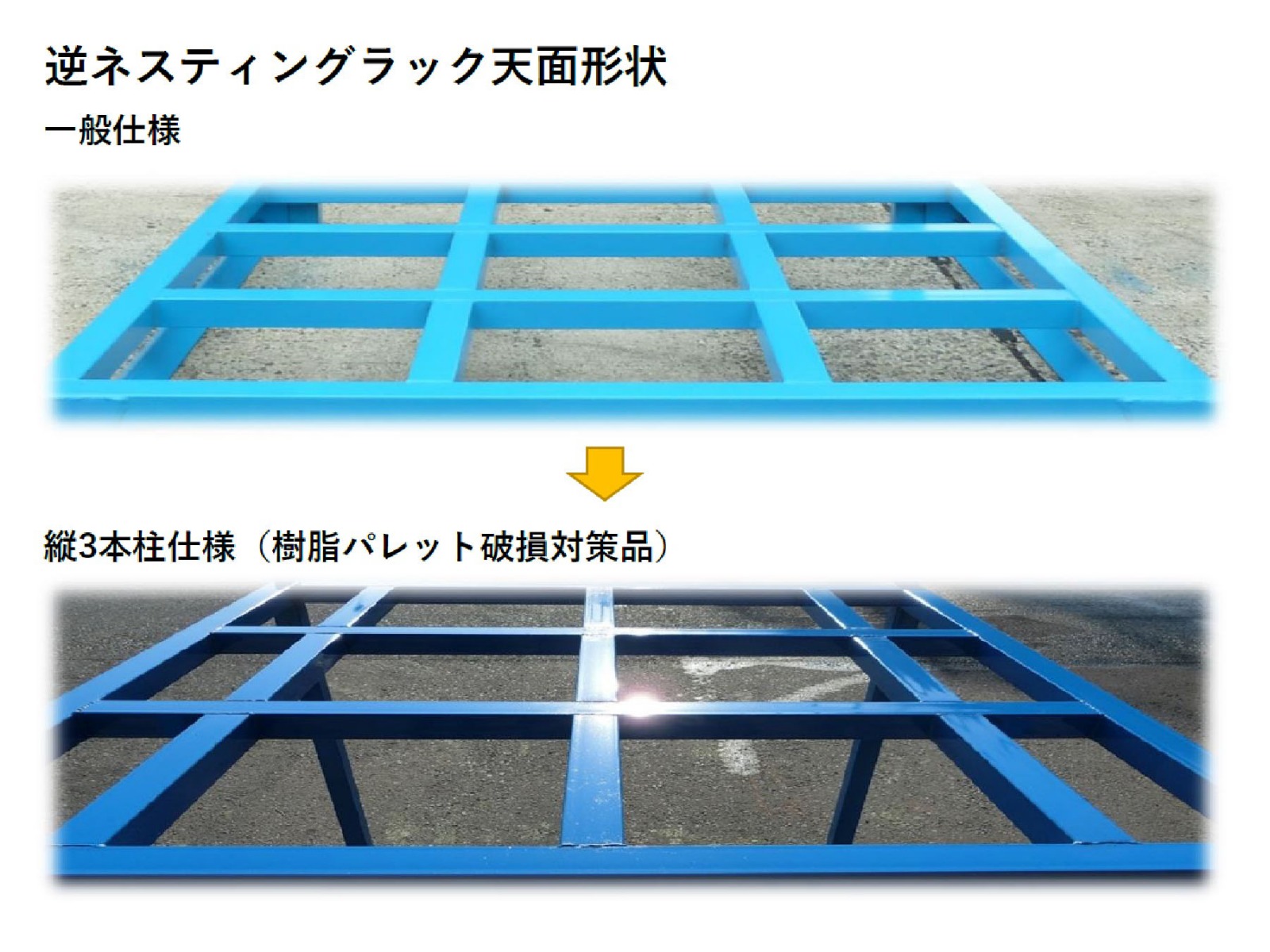 縦柱を3本仕様とし、パレットの強度の高い部分に柱が来るように考案しました。保管時に、パレットの割れ・たわみを抑え、べニア板を載せる等の作業ロスを軽減致します。