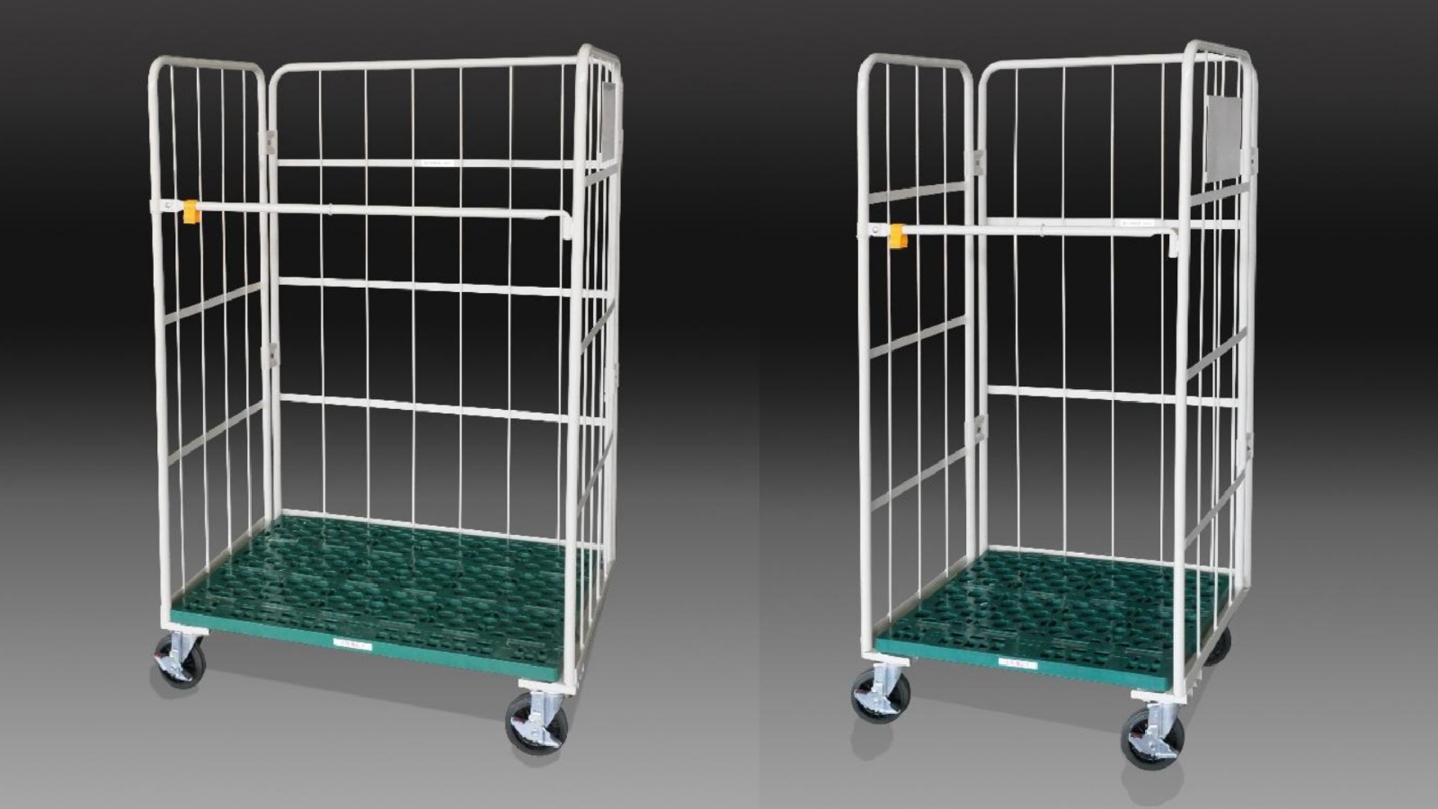3方向をカゴ状に囲い、積載物の荷崩れ・落下を防ぐ、キャスター付きの台車、不使用時には折りたたんで効率よく保管できます 。物流センターやスーパーなど、トラックの輸送から陳列までの移動を有効的に行う事が出来ます 。