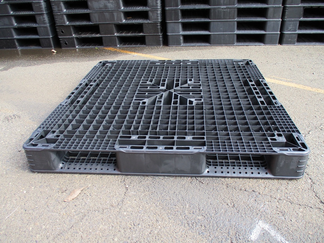 【中古】プラスチックパレット寸法:1,100×1,100×120Hmm両面四方差し、ハンドリフト対応不可色:黒色系保管場所:大阪府泉大津市出荷用両面パレット、軽量で取り回しの良い両面パレットです。在庫数:80枚販売価格:@1,200円(税別・運賃別)お引取り歓迎!(発送の場合はチャーター便扱いとなります)