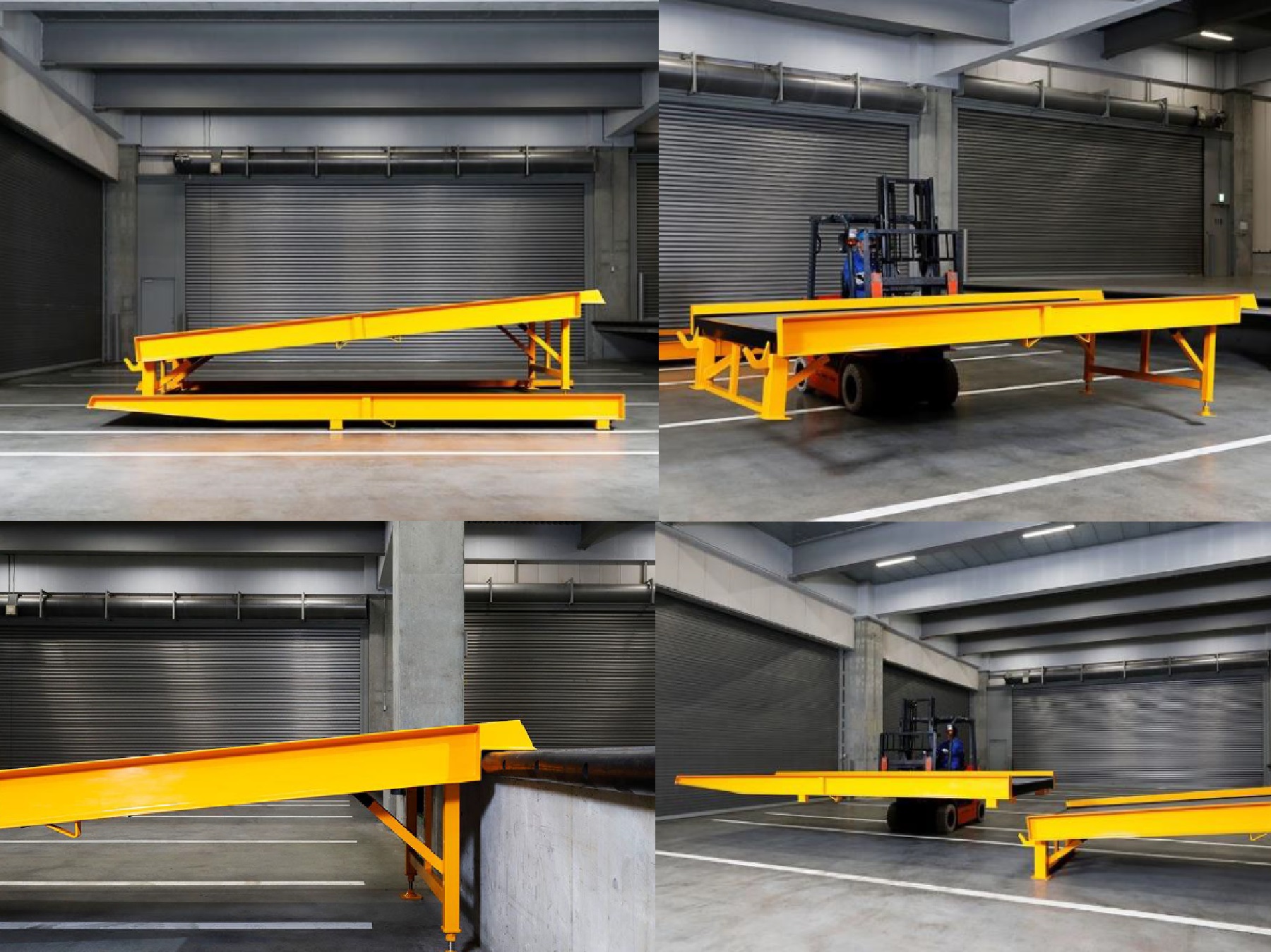【新品】スロープフォークリフト1台で移動・設置が可能!先端部を乗せかけるので、滑らかに走行〇可動式プラットホームスロープ参考寸法:長さ10,000×幅2,060×高さ1,000mm(2分割)耐荷重:6.5t質量:2.7t(2分割)*仕様・詳細につきましてはお問合せください